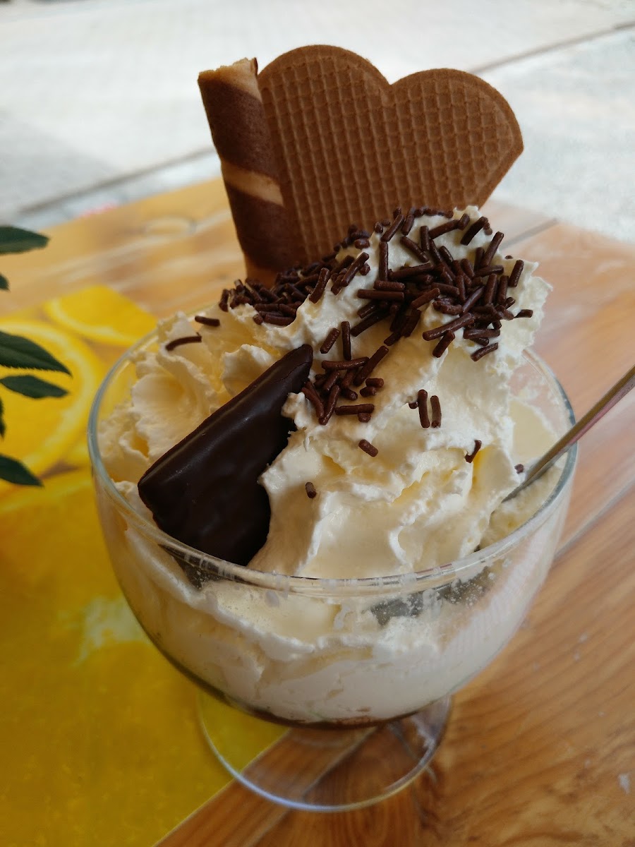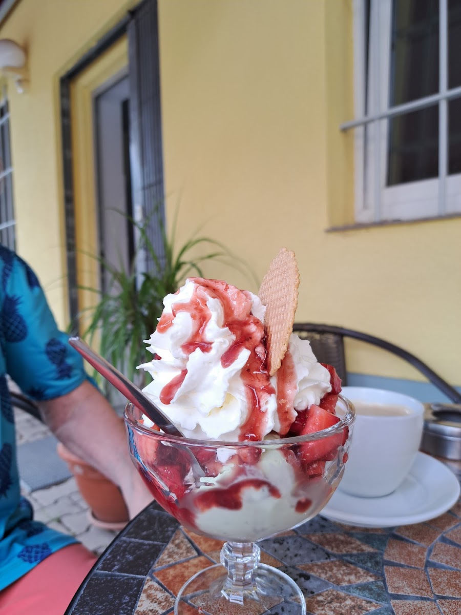 Leckeres Eis, es gibt draußen Sitzmöglichkeiten (auch für Eistütenesser! ) für uns schön in der Nähe. Kugel Eis kostet 1,70€, es gibt aber auch andere Eisvariationen.